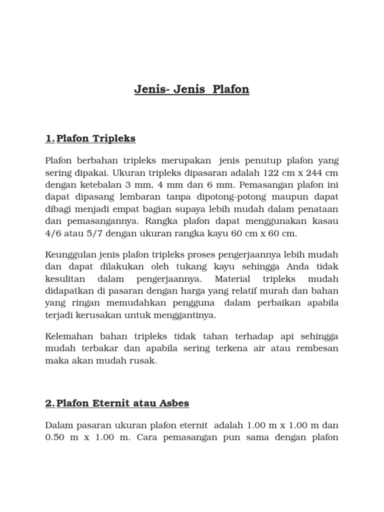 8 jenis plafon eternit rumah minimalis terbaru dari grc gypsum pvc ternit asbes dan harganya1. Atau jika masih terdengar asing setidaknya anda pasti sering melihatnya namun tidak tahu namanya. Keunggulan dari asbes ini, berlawanan dengan kelemahan dari plafon triplek yaitu lebih tahan api dan air. Plafon dari bahan asbes lebih ringan dan mudah diperbaiki. Anda dapat menggunakan kasau 4/6 atau 5/7 dengan ukuran rangka kayu 60 cm x 60 cm untuk rangka plafon.